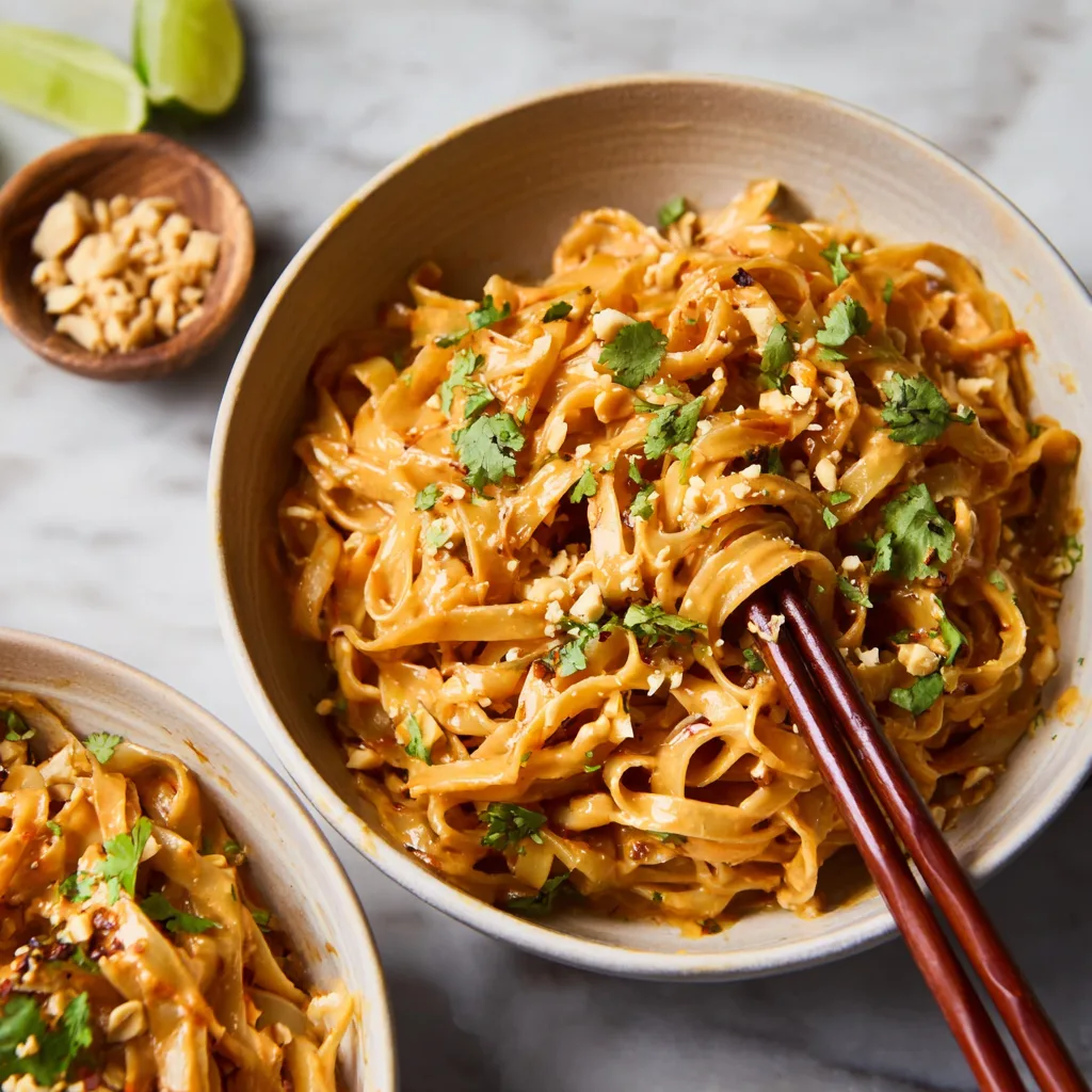 Drain the noodles (reserve a tablespoon of cooking water) and toss immediately with the peanut sauce. Adjust consistency with the reserved noodle water if needed — the sauce should coat every strand beautifully. - Garnish & Serve: