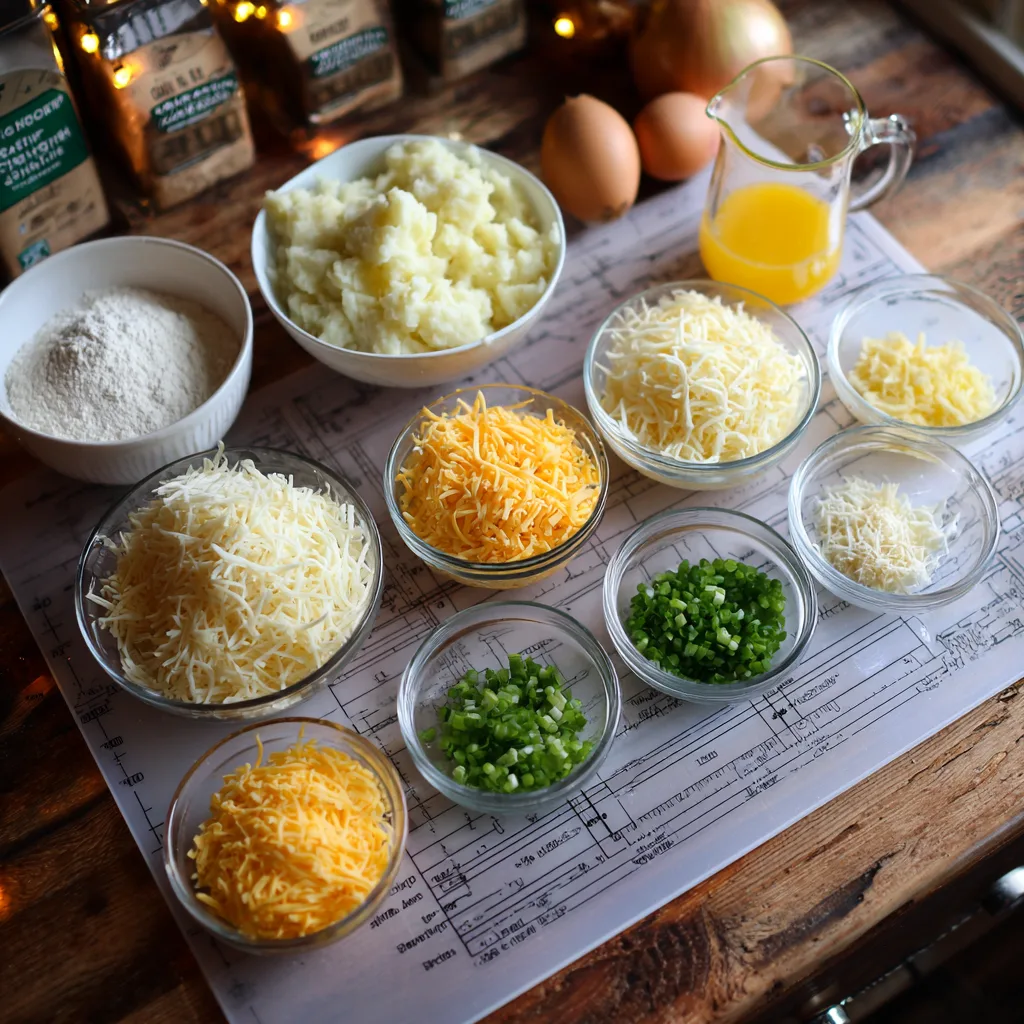 - In a large mixing bowl, combine cold mashed potatoes, cheddar cheese, mozzarella cheese, one beaten egg, green onions, minced garlic, salt, pepper, and paprika. Mix thoroughly until well incorporated.
