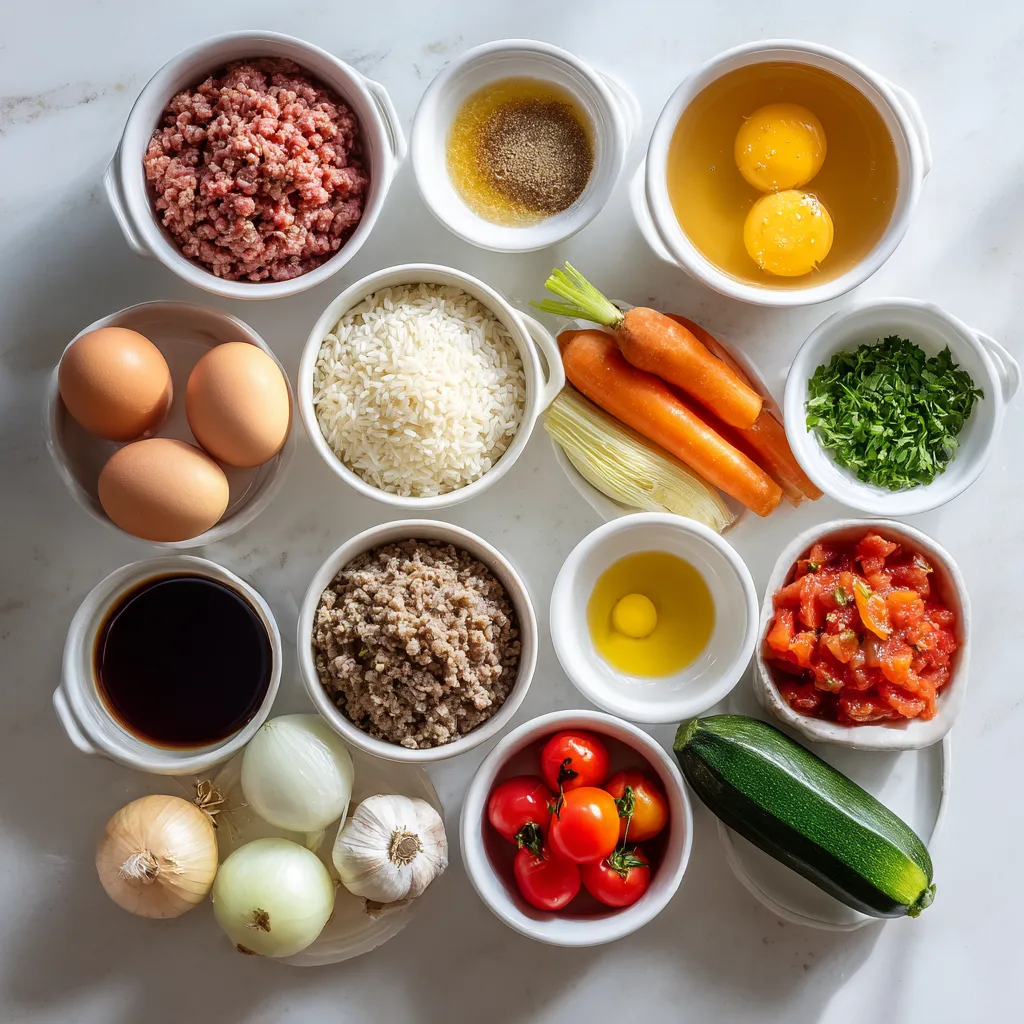 - In a large bowl, combine ground beef, uncooked rice, egg, chopped onion, garlic, cilantro, salt, and pepper. Mix gently until just combined.
