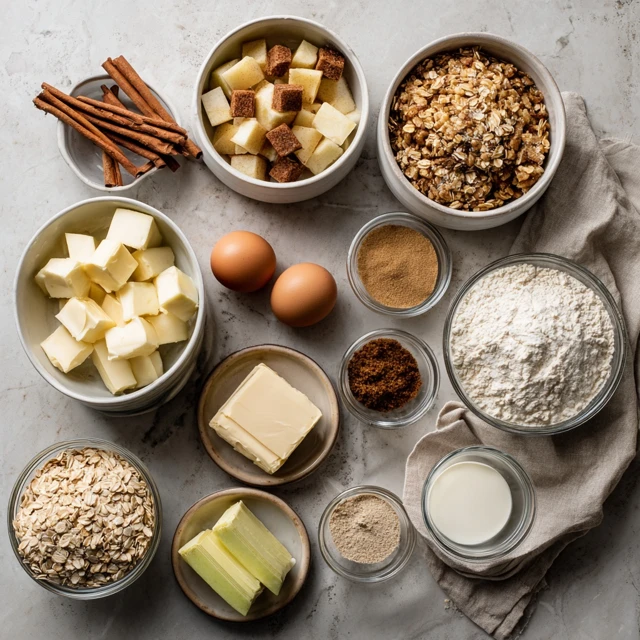 - In another bowl, combine oats, flour, brown sugar, and cinnamon. Cut in cold butter until crumbly.
