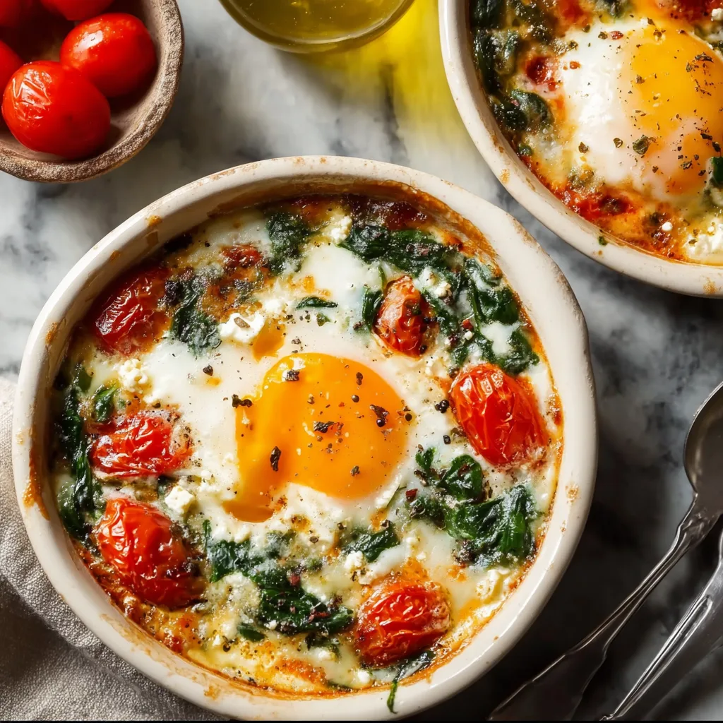 Baked Feta Eggs with Spinach and Tomatoes – A Mediterranean-Inspired Breakfast Favorite