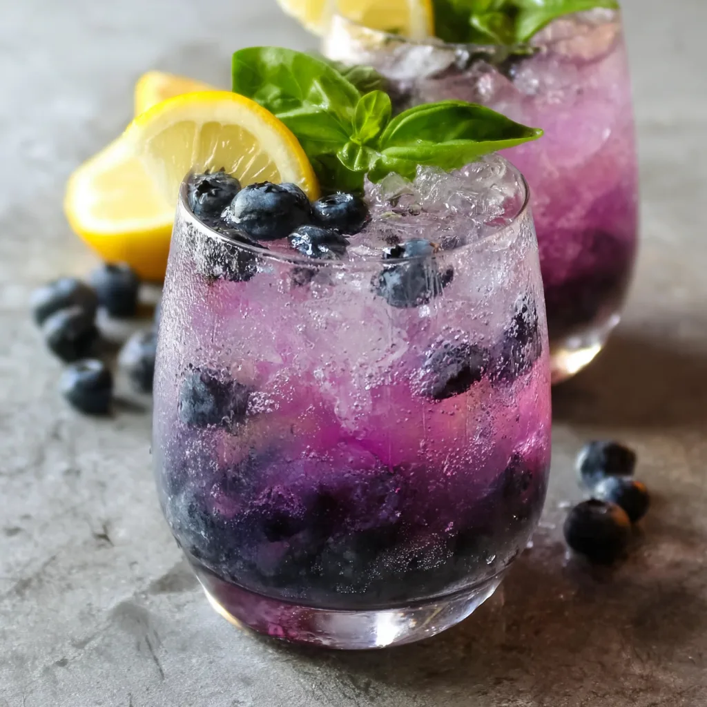 - Serve over ice, topped with sparkling water if desired, and garnish with basil, blueberries, or lavender.