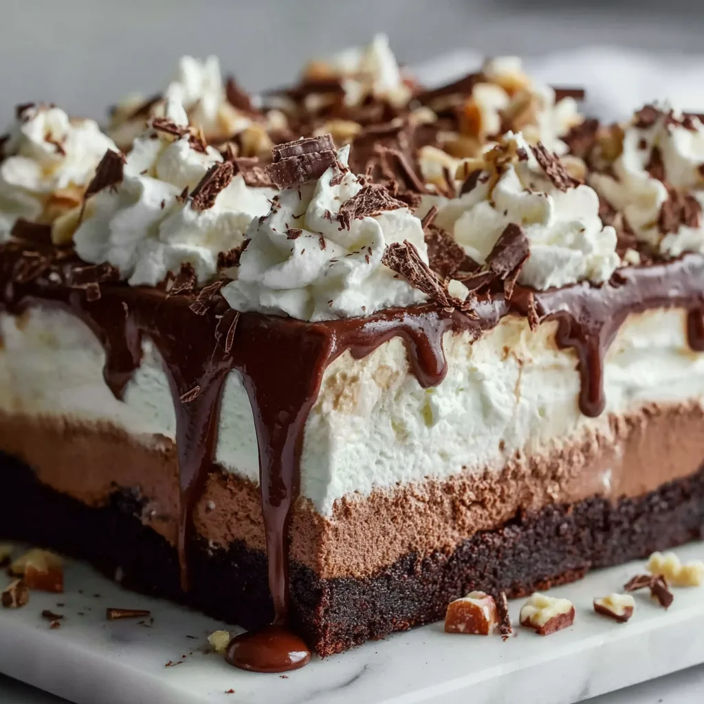 The final assembly is where your Brownie Refrigerator Cake transforms from simple ingredients into an impressive dessert. The whipped cream topping should be applied generously, creating swoops and peaks that catch the light and add visual dimension. Don’t worry about making it perfect—rustic, homemade charm is part of this dessert’s appeal. The chocolate drizzle should be applied while slightly warm so it flows naturally down the sides, creating those gorgeous rivulets that make the cake look bakery-worthy. Finally, the chocolate shavings and chopped nuts add textural contrast and professional finishing touches that elevate the entire presentation.