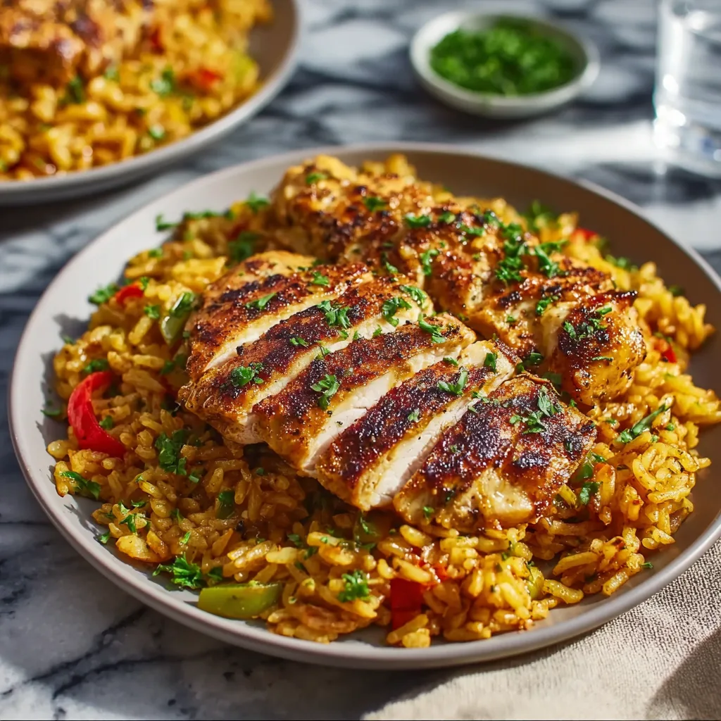 Nestle the seared chicken back into the skillet, covering it partially with the rice mixture. Reduce heat to low, cover the skillet, and simmer for 18–22 minutes, until the rice is tender and the chicken is fully cooked through (internal temp 165°F / 74°C). - Rest & Garnish: