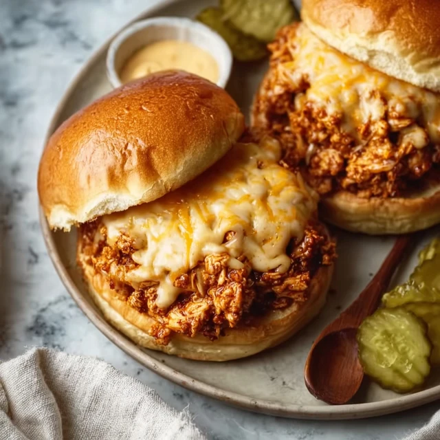 - Spoon chicken onto toasted buns and top with cheese sauce.