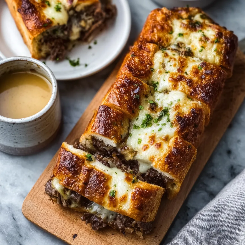 The result is a show-stopping dish that works as an appetizer, a shareable party food, or even a casual dinner when paired with a simple side. Each slice delivers crispy bread on the outside, soft and fluffy bread on the inside, and a rich, cheesy steak filling that’s impossible to resist.