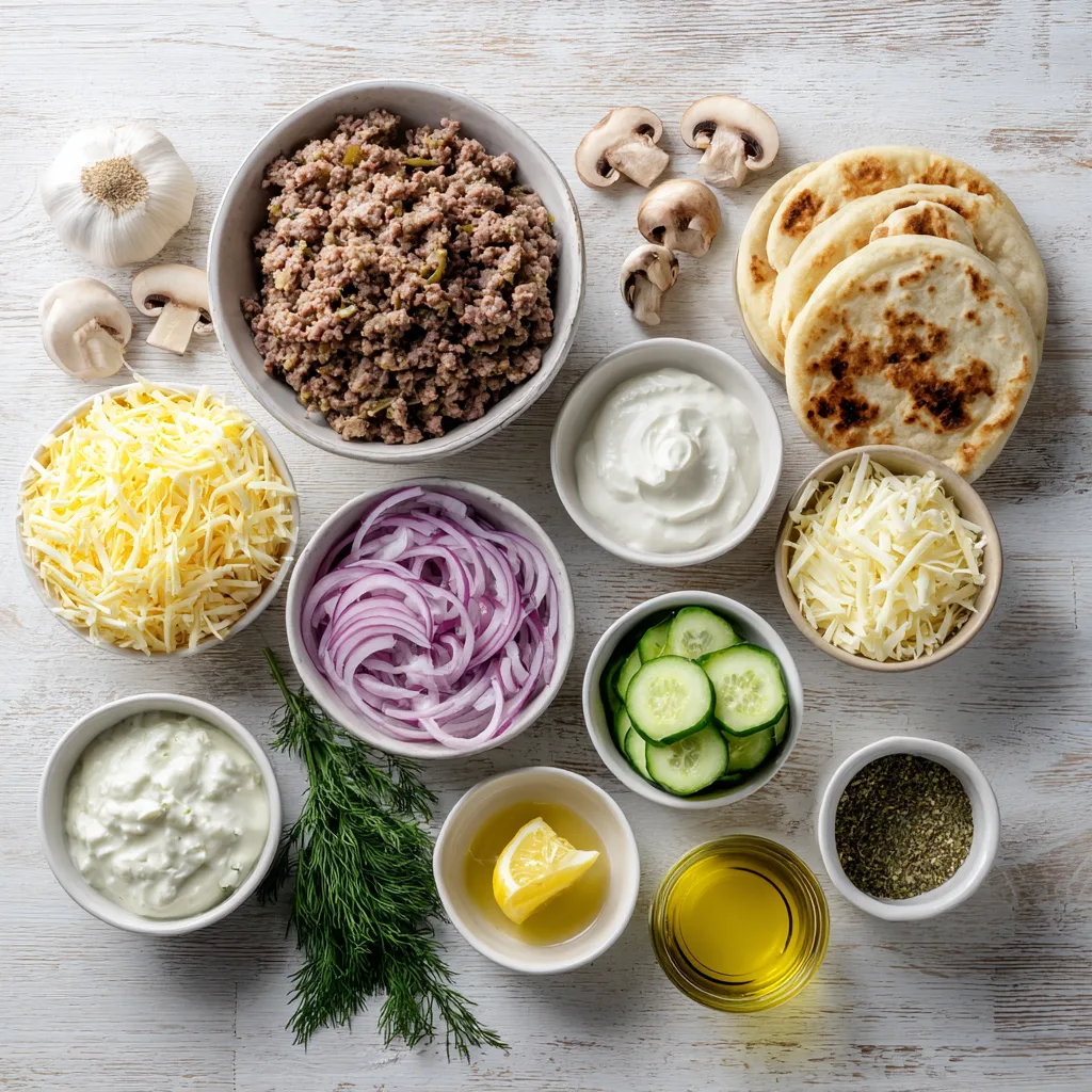 It’s the perfect mix of comfort and freshness. The beef and mushrooms create a rich, hearty filling that feels like a cozy skillet meal, while the crisp cucumber, dill, lemon, and yogurt sauce brighten everything up. The combination is addictive: warm + cool, cheesy + tangy, meaty + refreshing.