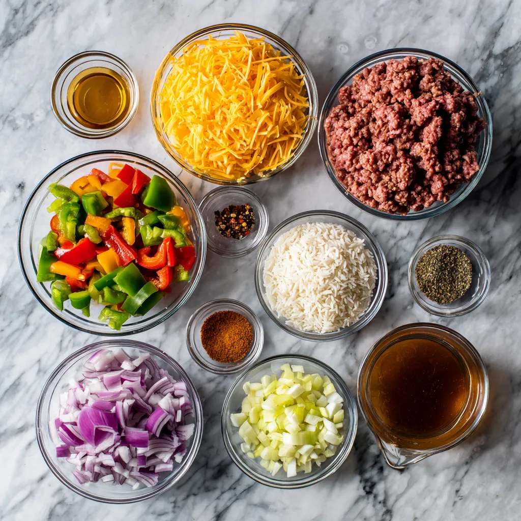 While the Cheesy Ground Beef and Rice Casserole is undeniably comfort food, it does offer nutritional value. Ground beef provides high-quality protein, iron, and B vitamins, all essential for energy and overall health. If you’re concerned about fat content, you can easily use lean or extra-lean ground beef, which significantly reduces the fat while maintaining the protein content. The rice provides complex carbohydrates for sustained energy, and the bell peppers contribute vitamin C, vitamin A, and fiber. To boost the nutritional profile further, you can increase the vegetable-to-meat ratio, adding more peppers or incorporating other vegetables like carrots, celery, or spinach. Using brown rice instead of white rice adds fiber and additional nutrients, though you’ll need to adjust the cooking time and liquid amounts. For a lower-sodium version, use low-sodium beef broth and reduce or eliminate the added salt. The cheese, while high in calcium, also contributes saturated fat and sodium, so if you’re watching these nutrients, you might reduce the cheese quantity to one cup instead of two, or use a reduced-fat cheese option. Despite being a rich, filling dish, when portioned appropriately and served with vegetable sides, this casserole can fit into a balanced diet.
