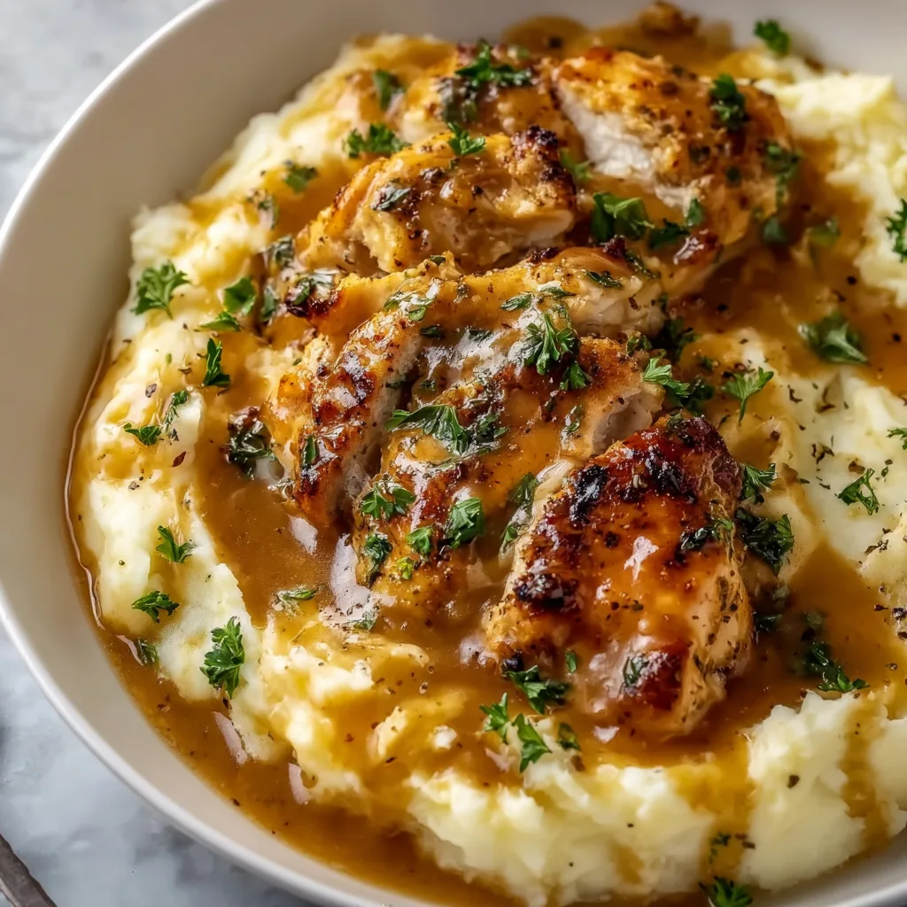 Juicy seasoned chicken smothered in rich garlic gravy served over ultra-creamy cheesy mashed potatoes—a warm, comforting, satisfying meal made with simple ingredients.