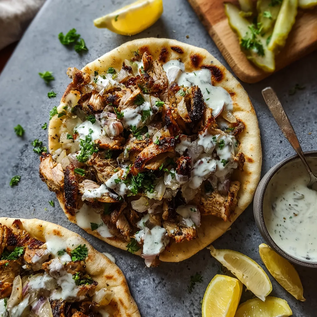 Serve sliced chicken drizzled generously with garlic sauce, alongside pita, pickles, and fresh vegetables.