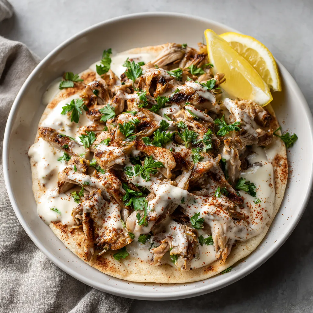 Fill pita or flatbread with sliced chicken, fresh vegetables, and a generous drizzle of garlic sauce. - Serve and Enjoy