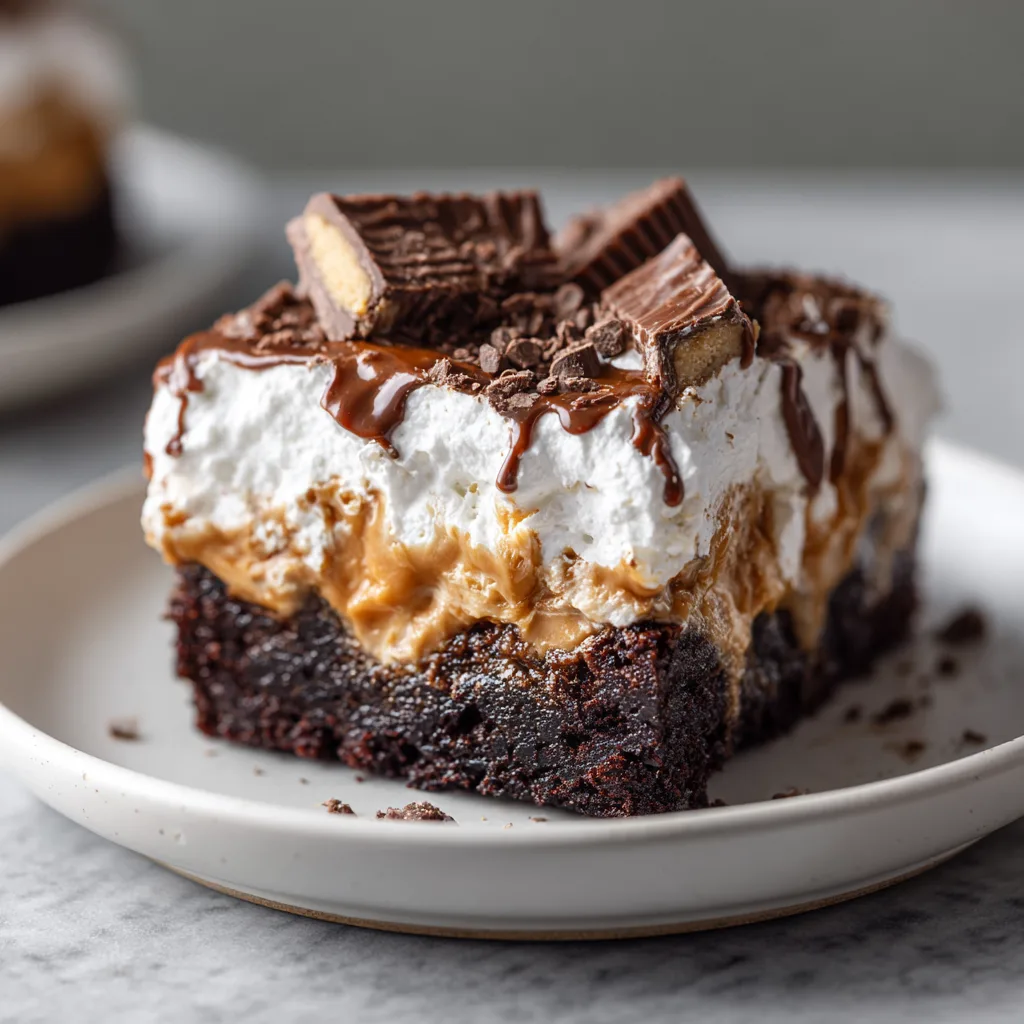 - Garnish the top with chocolate shavings and chopped peanut butter cups, distributing them evenly across the surface. Refrigerate until ready to serve.