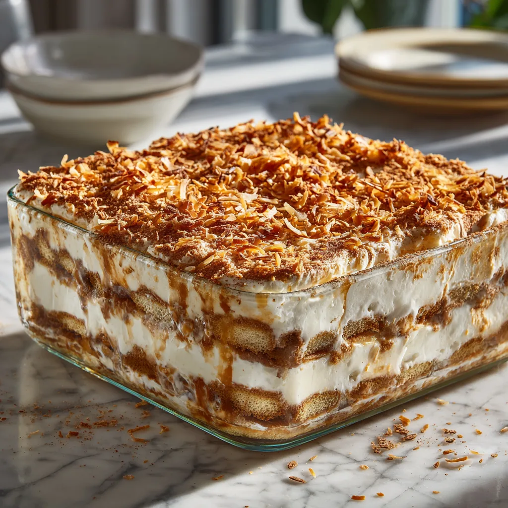 - Repeat the soaking and layering process with remaining ladyfingers, creating a second cookie layer over the cream, then top with the final portion of mascarpone coconut mixture, smoothing the top surface as evenly as possible.