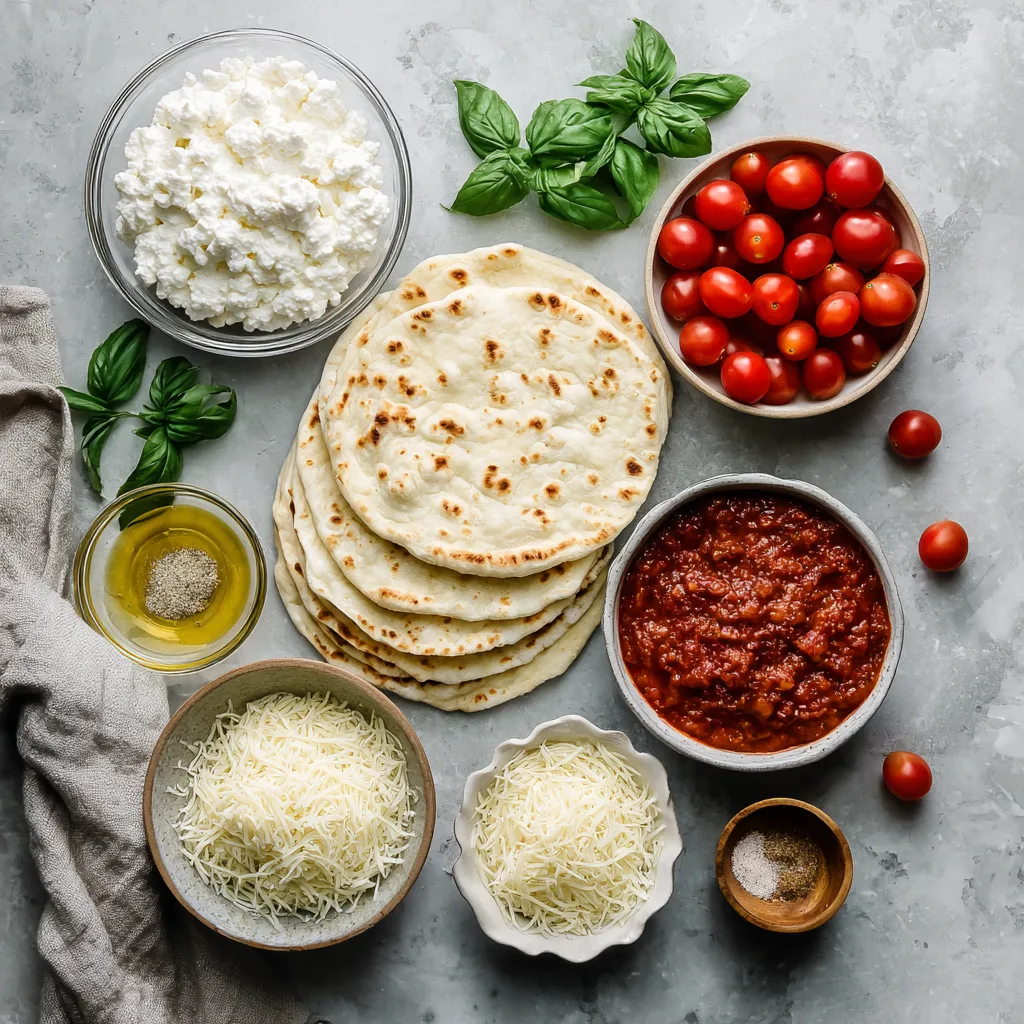 Unlike traditional pizza dough, this recipe uses a flatbread base topped with a protein-rich cottage cheese mixture. The egg helps bind the cottage cheese, creating a creamy layer that firms up beautifully when baked.