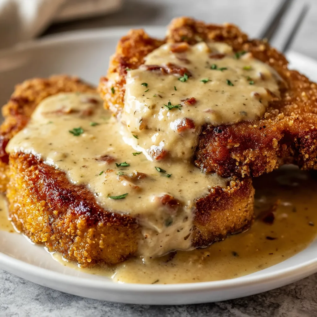 Think chicken-fried steak meets pork chops, upgraded with the kind of thick country gravy you only get in Southern kitchens. The crunchy breading gives way to juicy pork inside, and every bite is coated in savory gravy loaded with bacon. Whether you’re making Sunday dinner, a cozy fall meal, or a family-friendly favorite, this recipe hits every comfort-food craving.