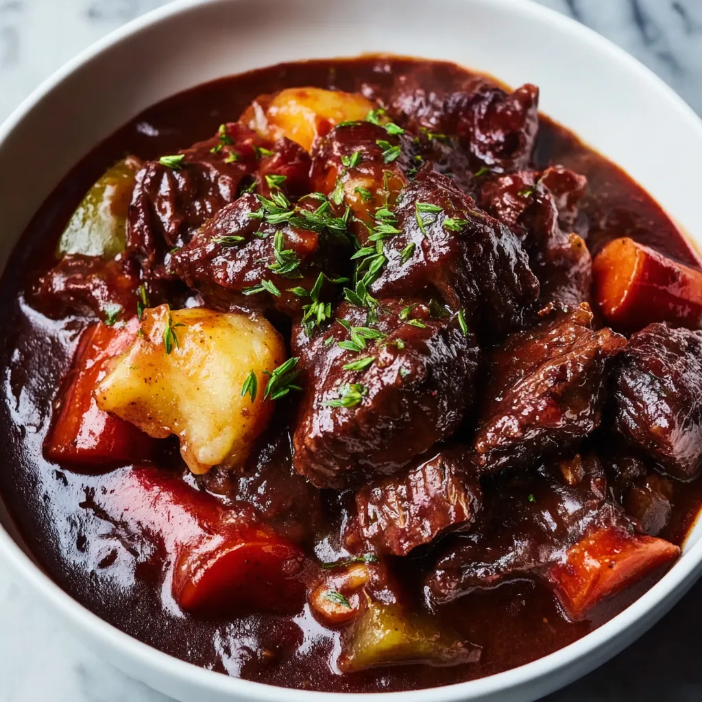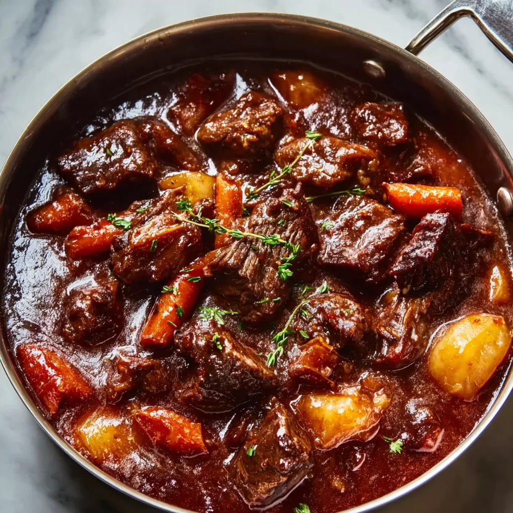 For wine pairing, choose something that complements the red wine used in cooking. A medium to full-bodied red wine like Cabernet Sauvignon, Merlot, or Côtes du Rhône works beautifully. The tannins in red wine help cleanse the palate between bites of the rich, hearty stew.