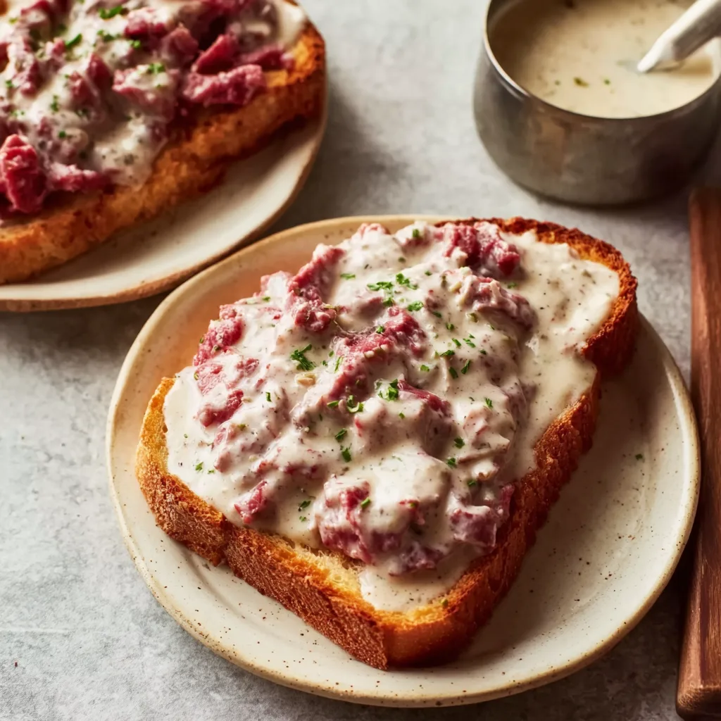 The magic is in the balance: salty, thin-sliced chipped beef simmered in a silky white sauce with butter, milk, and pepper, then poured over buttery toast. The recipe is incredibly fast — often ready in 15 minutes — and uses only pantry staples. It’s perfect when you want something warm, comforting, and satisfying without any fuss.