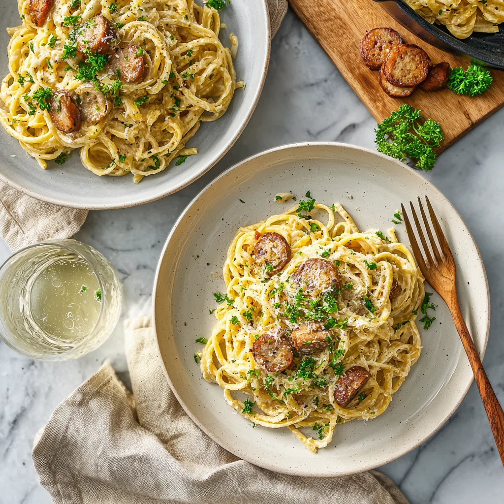 Return cooked sausage to the skillet. Add drained pasta and toss until everything is coated in the creamy sauce. If needed, add a splash of reserved pasta water to loosen the sauce.