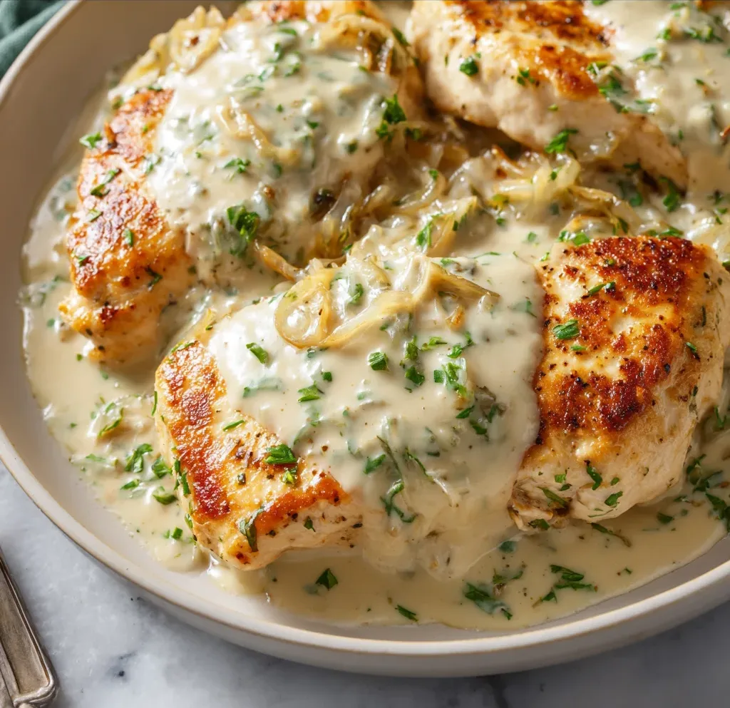 It’s a skillet meal that delivers restaurant-level taste with simple ingredients you already have in your kitchen. Juicy pan-seared chicken is nestled in a rich, velvety sauce made with caramelized onions, garlic, chicken broth, and tangy sour cream. Every bite melts in your mouth, perfectly balanced between creamy, savory, and just a little tangy.