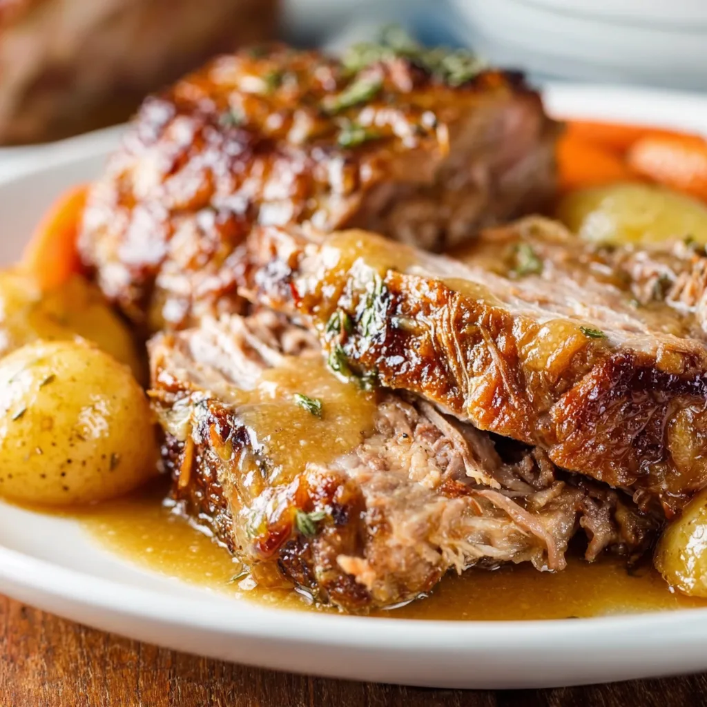- Serve: Slice or shred the pork roast, spoon over the gravy, and serve with the tender carrots and potatoes. Garnish with chopped parsley or rosemary for a beautiful finish.