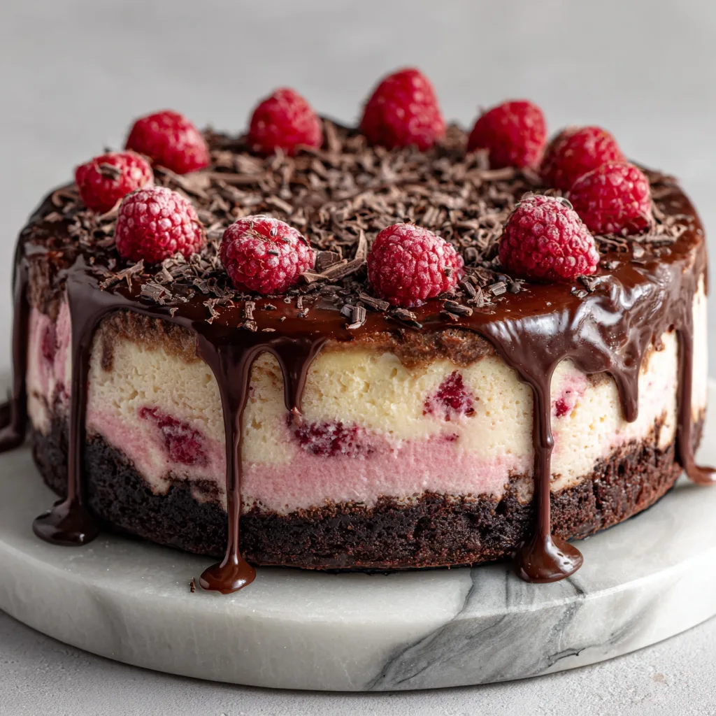 The brownie base provides a sturdy foundation with its dense, fudgy texture that stands up beautifully to the creamy layers above. Unlike traditional graham cracker crusts that can sometimes become soggy, the brownie bottom maintains its structure while contributing an additional layer of chocolate flavor that complements the ganache topping. The middle cheesecake layer offers a luxurious, smooth texture that melts on your tongue, with the raspberry puree creating stunning marbled patterns throughout. Finally, the dark chocolate ganache crowns this creation with a glossy, mirror-like finish that drips elegantly down the sides, adding both visual drama and an extra dose of rich chocolate flavor that ties all the components together.