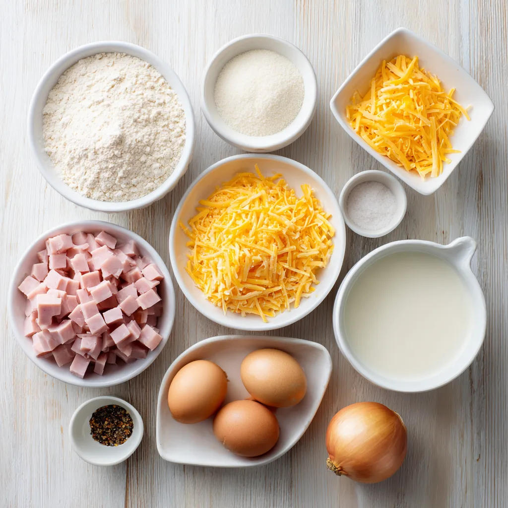 Add diced ham, shredded cheddar, mozzarella or Swiss, and onions to the bottom of the pie dish. Spread evenly. - Mix the batter.