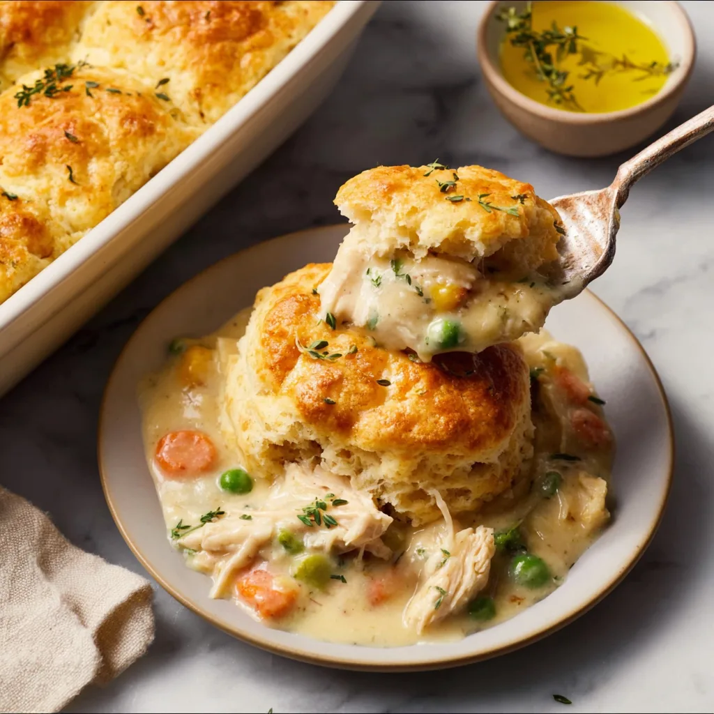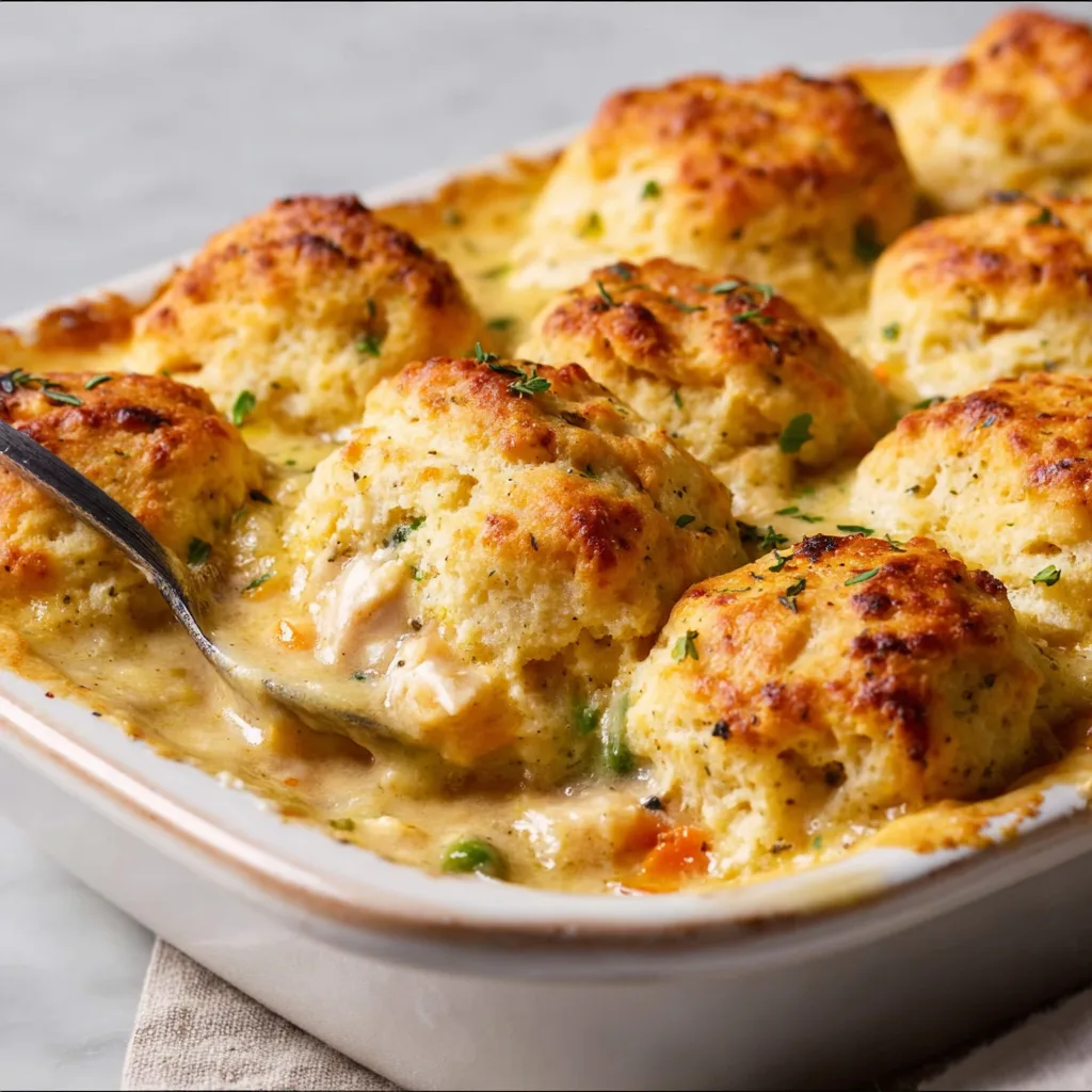 This recipe takes everything people love about classic chicken pot pie and transforms it into a simpler, more crowd-pleasing bake. Instead of a traditional crust, the topping is inspired by beloved cheddar bay biscuits—soft, buttery, cheesy, and flecked with herbs. The result is a dish that feels familiar, comforting, and downright addictive.