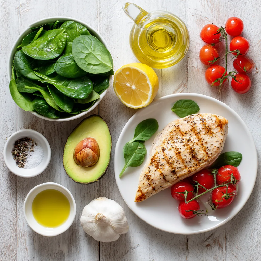 - Assemble plate with chicken, vegetables, and avocado.