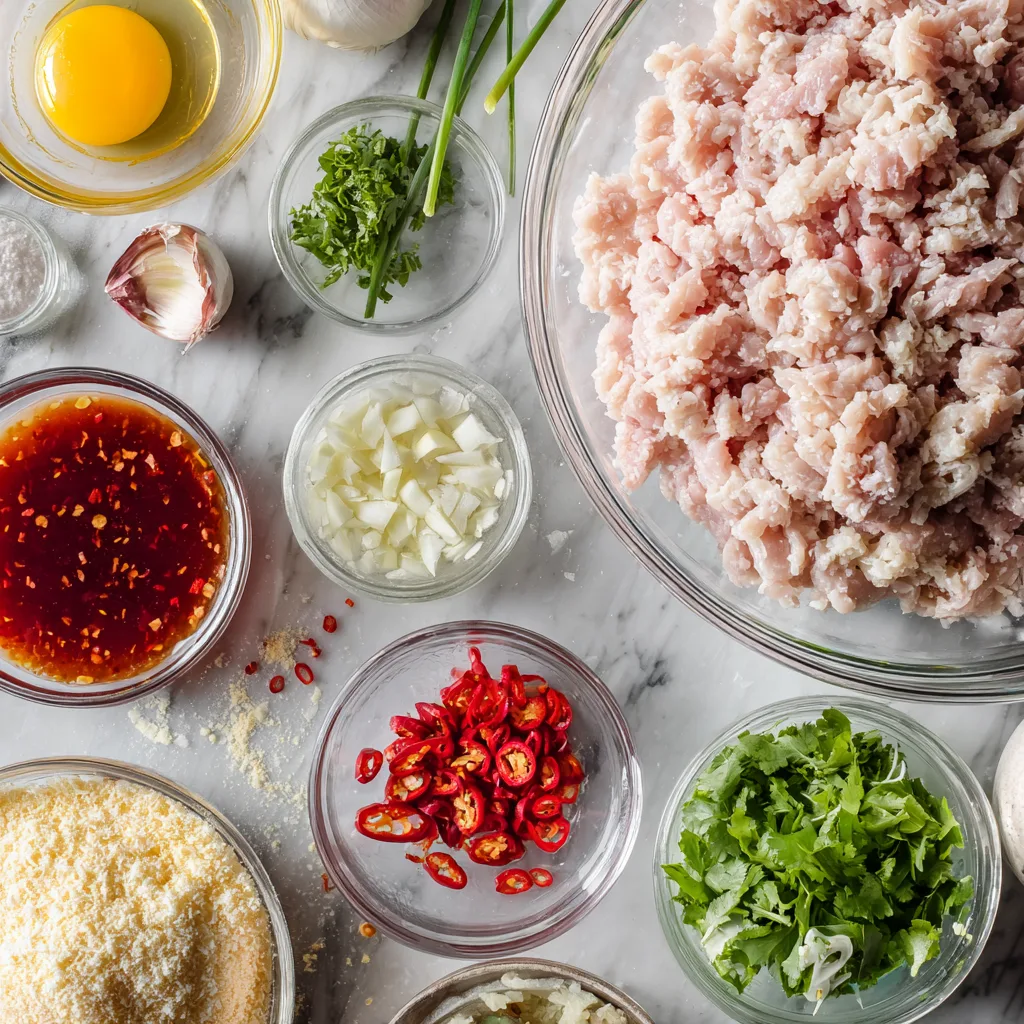 - In a large bowl, combine ground chicken, panko breadcrumbs, beaten egg, minced garlic, cilantro, green onions, red chili peppers, fish sauce, salt, and black pepper. Gently mix until just combined.