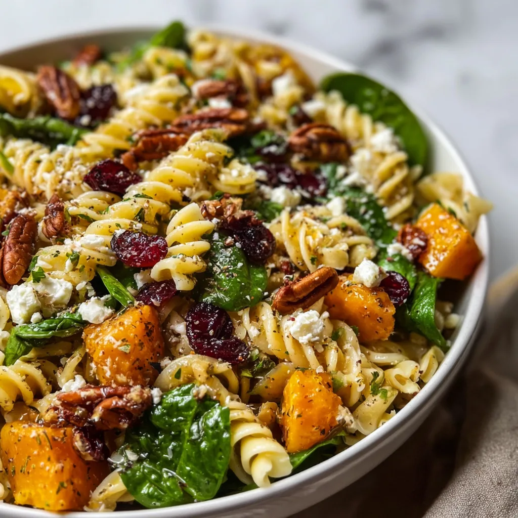 This pasta salad succeeds because it layers flavors and textures thoughtfully. Soft pasta contrasts with crisp roasted squash. Sweet dried cranberries offset tangy goat cheese. Crunchy pecans add richness, while fresh greens keep the dish light and balanced.