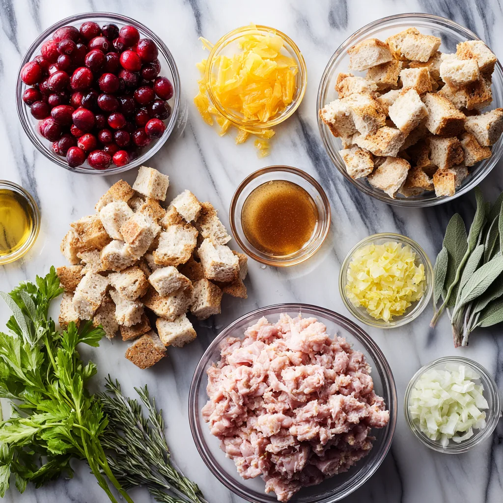 - Add the cooked turkey and onion mixture to the bowl with the soaked bread cubes, then add the chopped cranberries, shredded cheese, fresh parsley, sage, remaining melted butter, thyme, and rosemary if using.