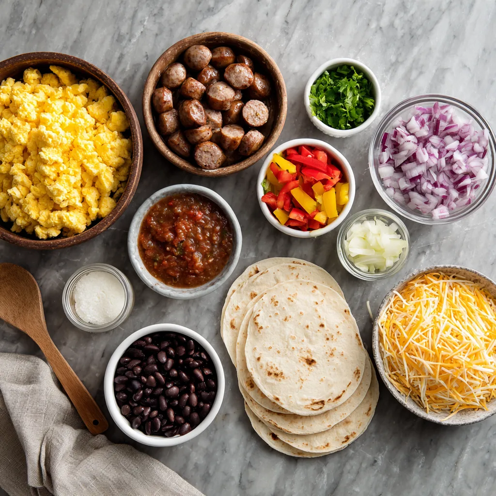 Lay out tortillas on a clean surface. Divide the sausage, veggies, eggs, black beans, and shredded cheese evenly among them. Keep fillings in the center to make wrapping easier.