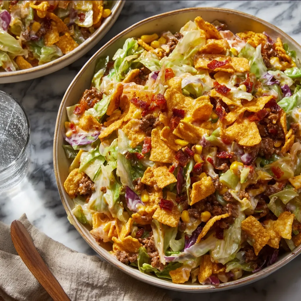 This dish works because it’s bold, balanced, and built on simple techniques. The cabbage softens without becoming mushy, the beef provides savory depth, and the Fritos add the crunch that takes it over the top. It’s comfort food with personality—unpretentious, filling, and deeply satisfying.