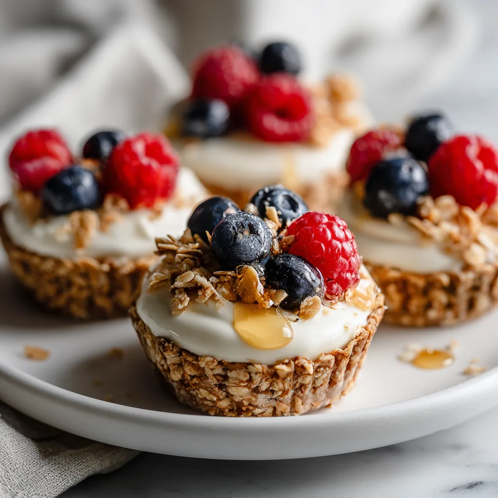 - Spoon the yogurt mixture evenly into each granola shell, filling nearly to the top. Smooth the surface with the back of a spoon.