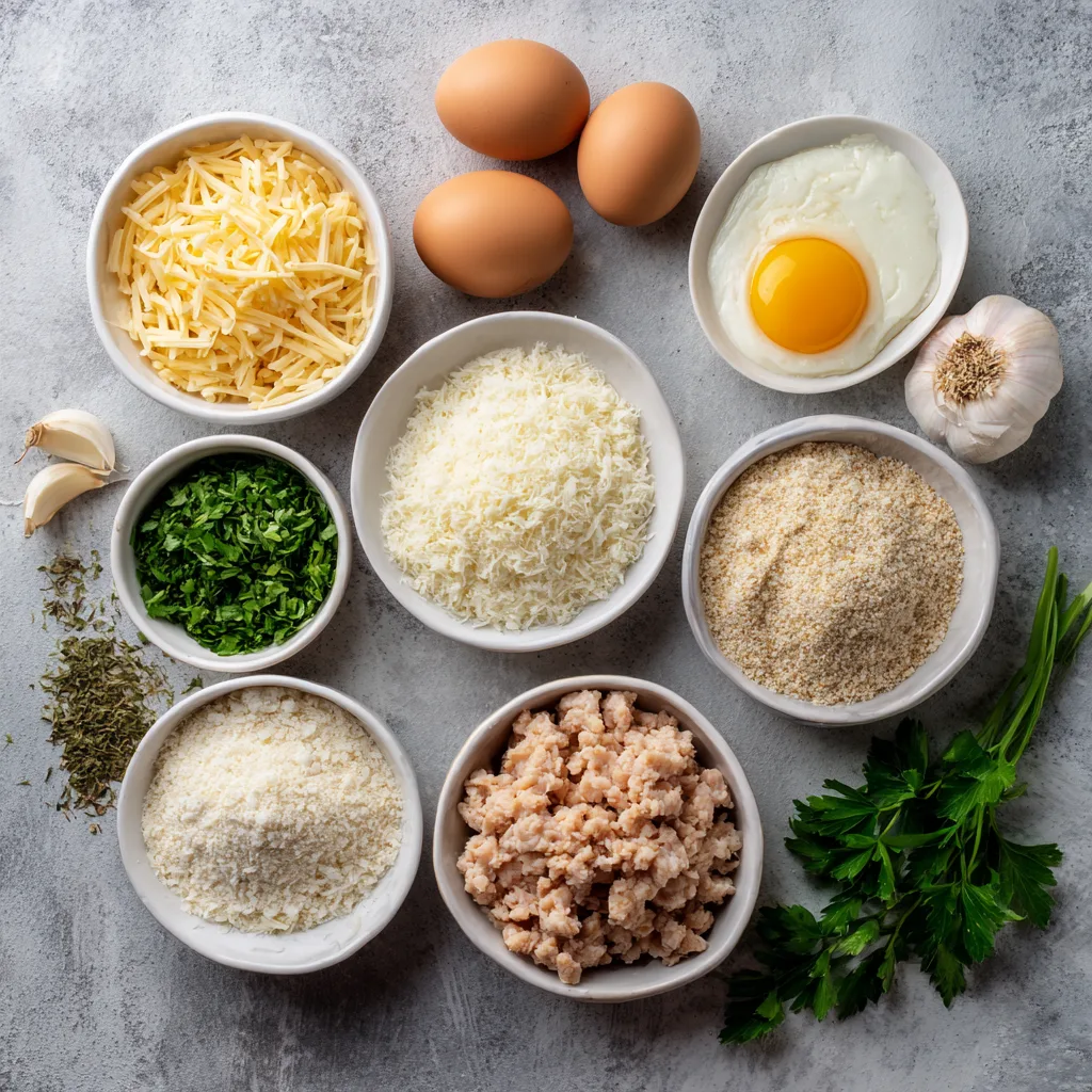 - In a large bowl, combine ground chicken, parmesan, breadcrumbs, garlic, and seasonings.