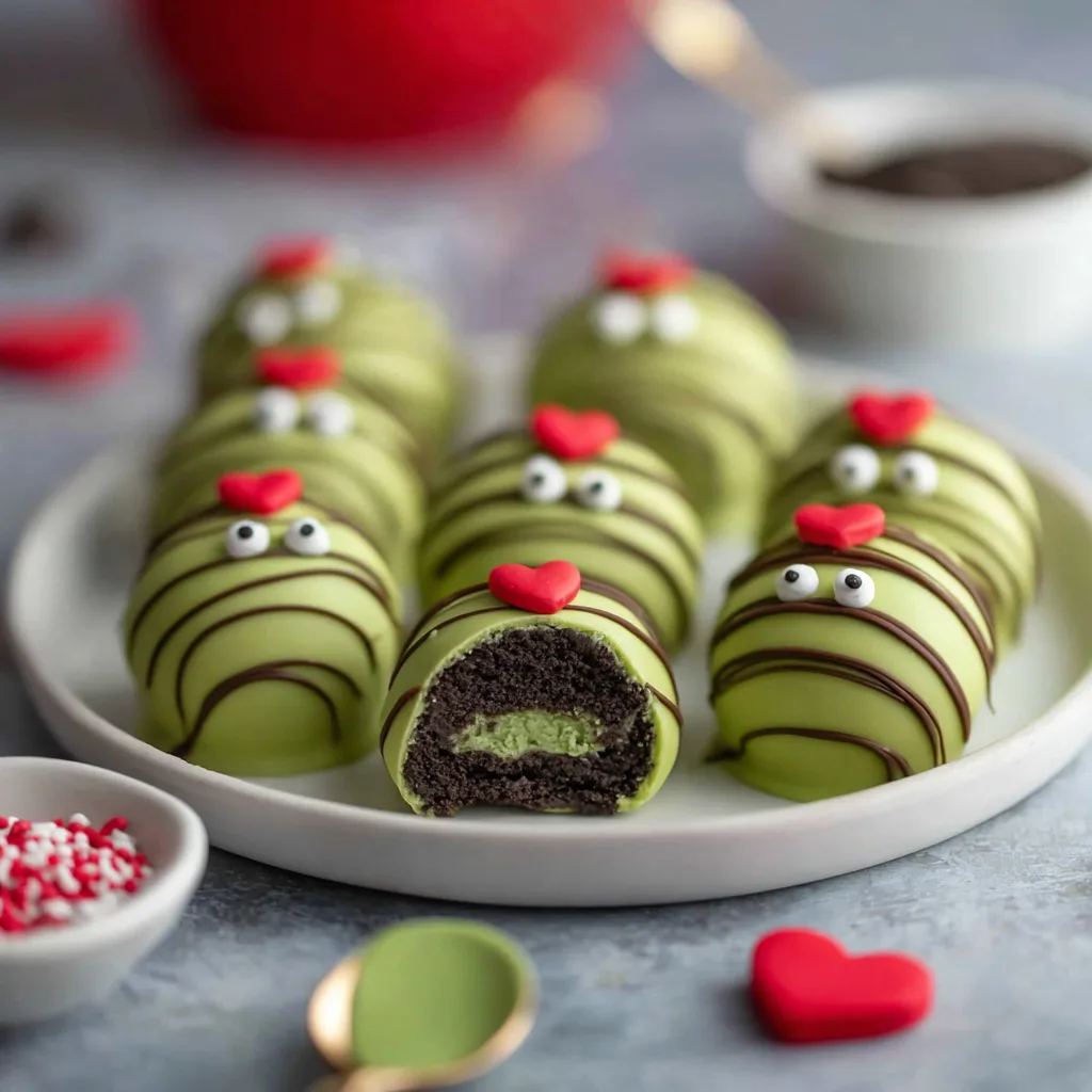 These truffles combine crushed Oreo cookies and cream cheese into a rich, fudgy center that melts in your mouth. Each bite is coated in vibrant green chocolate and finished with a red heart—symbolizing the Grinch’s growing heart and adding an instantly recognizable holiday touch.