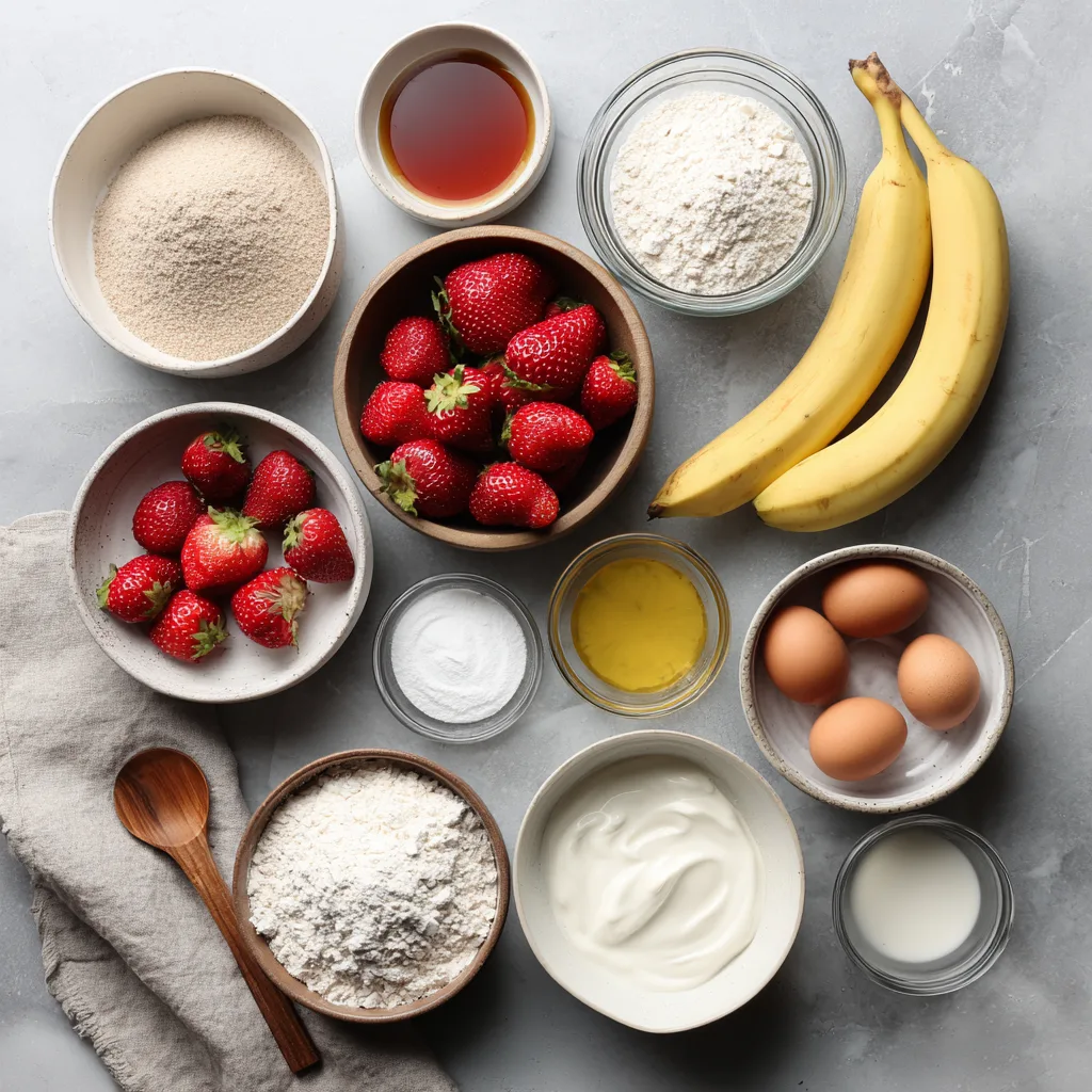 Bananas provide structure and moisture. Yogurt enhances tenderness while boosting protein. Strawberries add natural bursts of sweetness and color.