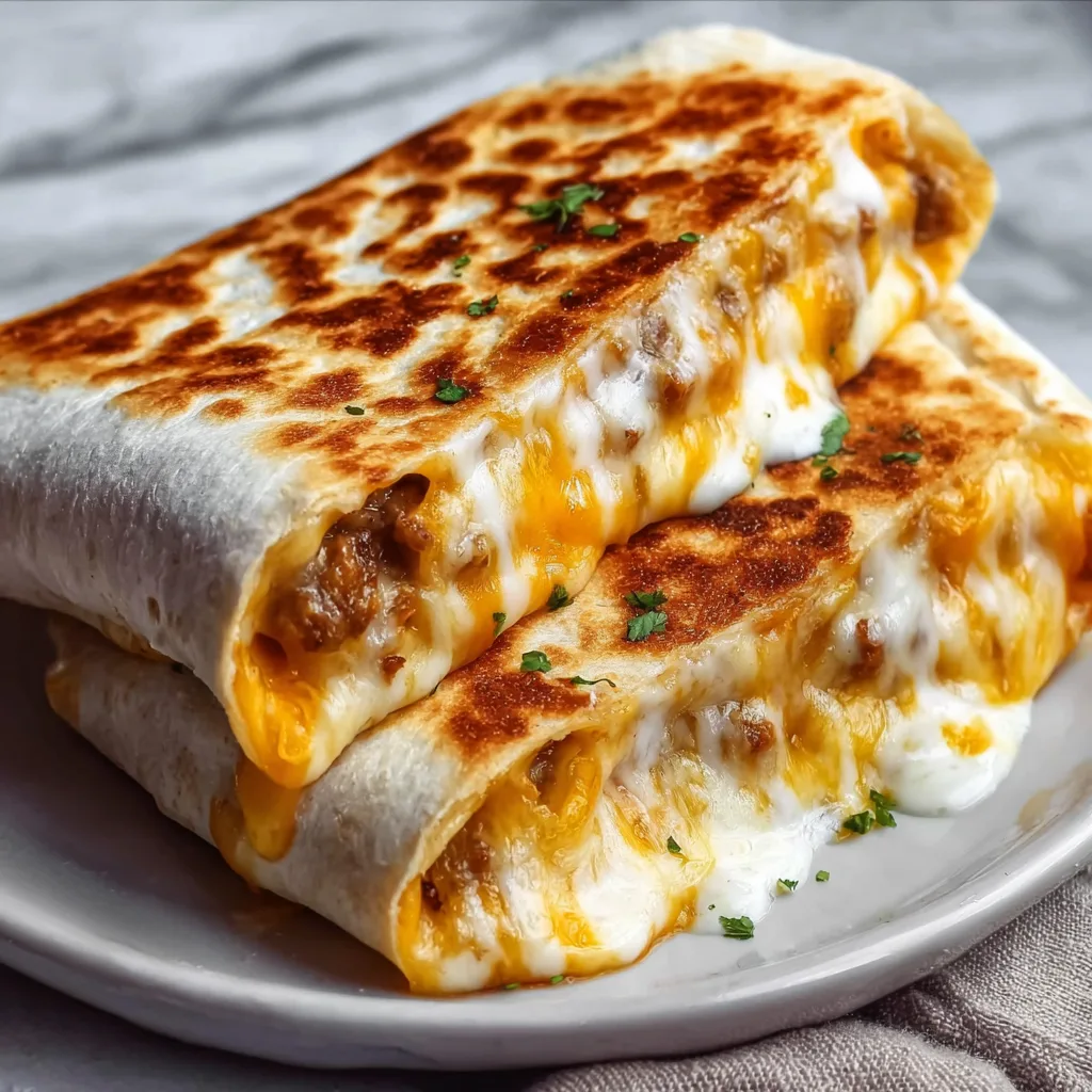 This recipe is inspired by the bold, indulgent flavors people crave but refined for the home kitchen. The tortilla is pan-grilled with melted cheese directly on the outside, creating a golden, crispy shell that seals in layers of seasoned beef, fluffy rice, and creamy sauces. Every bite delivers crunch, richness, and warmth.