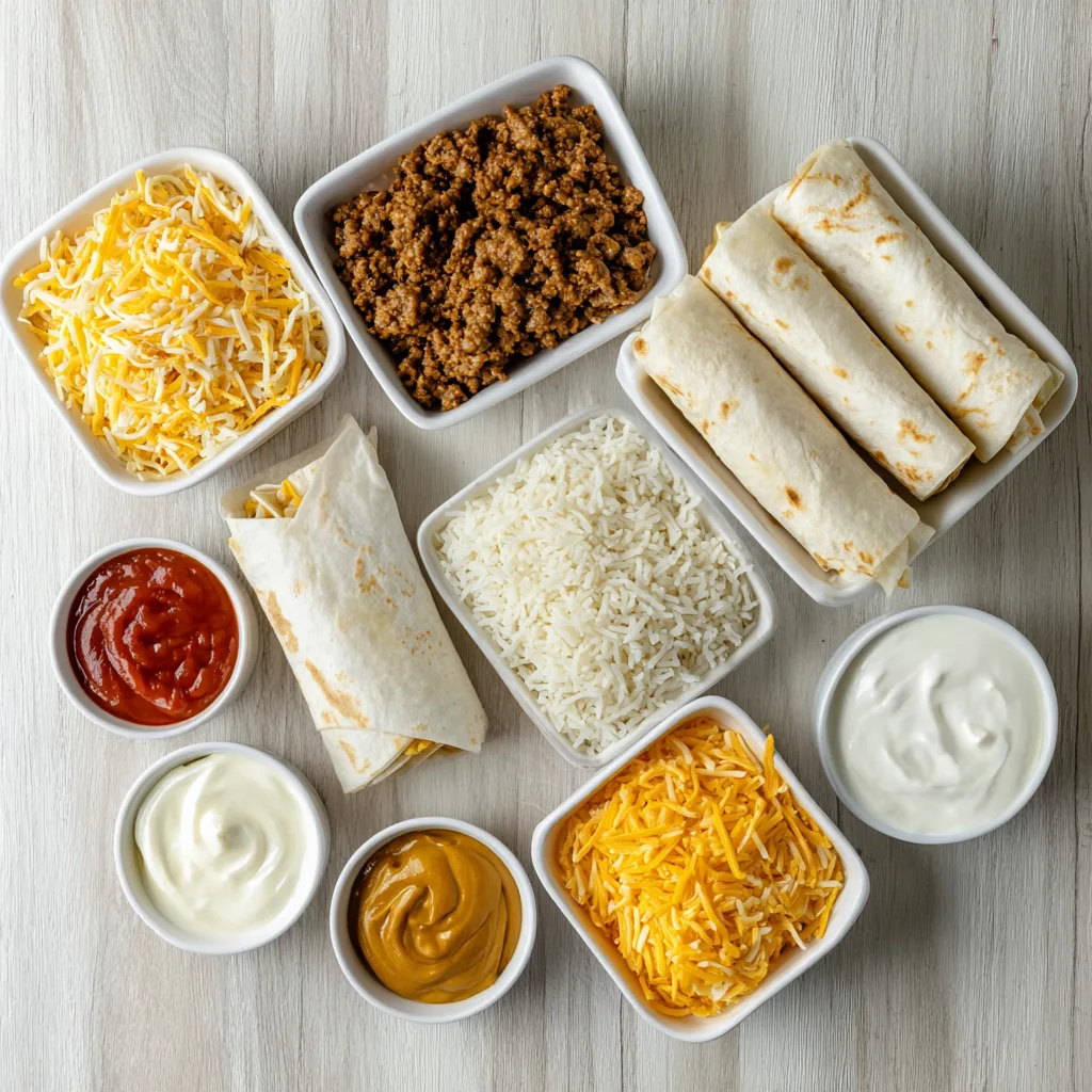 - Assemble each burrito by layering rice, seasoned beef, shredded cheese, nacho cheese sauce, and sour cream in the center.