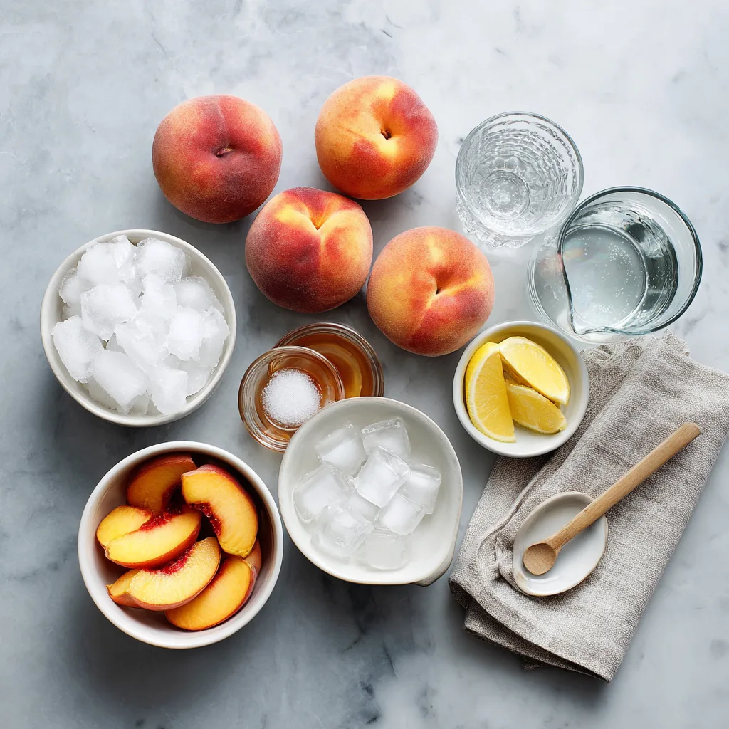 - Add frozen peaches, fresh peaches (if using), ice cubes, sugar or honey, and lemon juice to a high-powered blender.