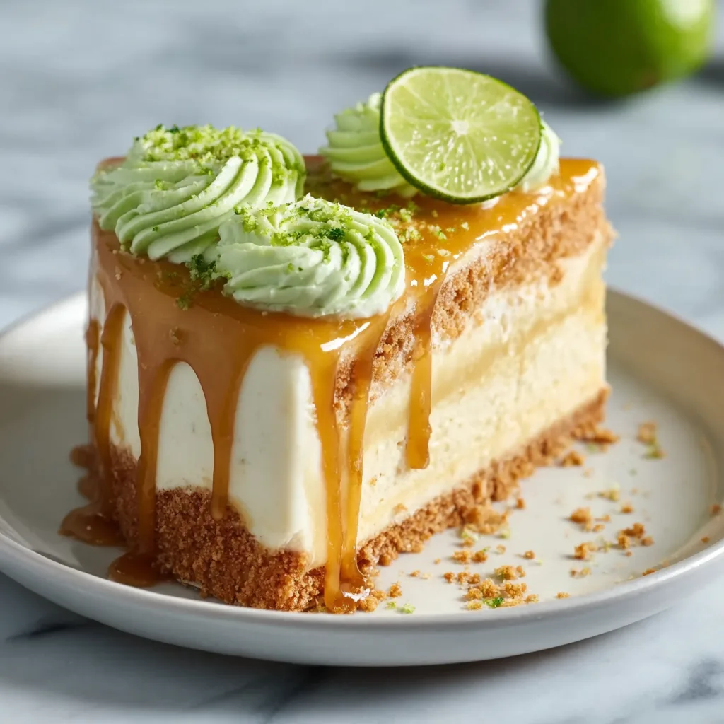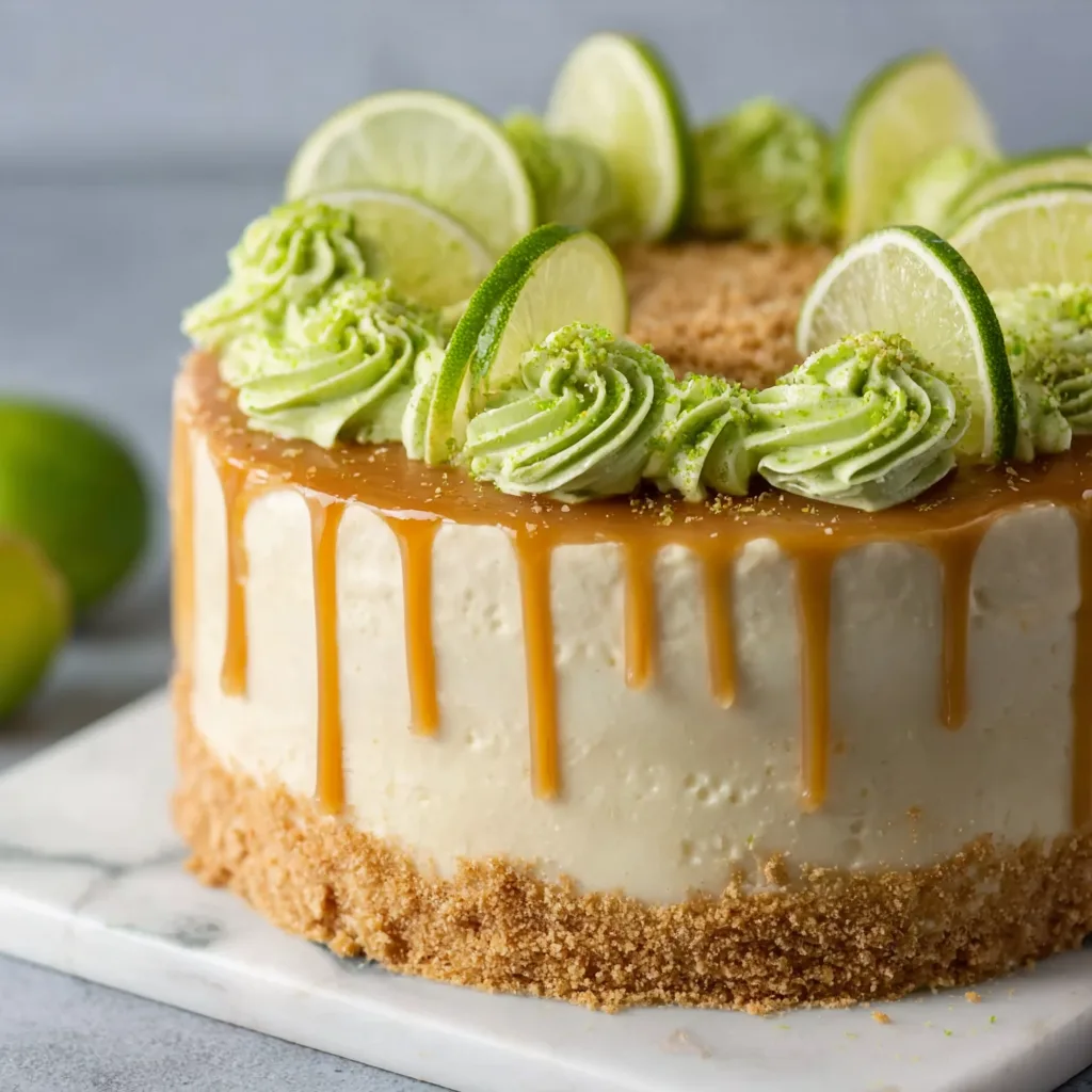 - Drizzle caramel sauce over the top of the cake, allowing it to drip down the sides naturally. Garnish with fresh lime slices and additional lime zest. Refrigerate until ready to serve.