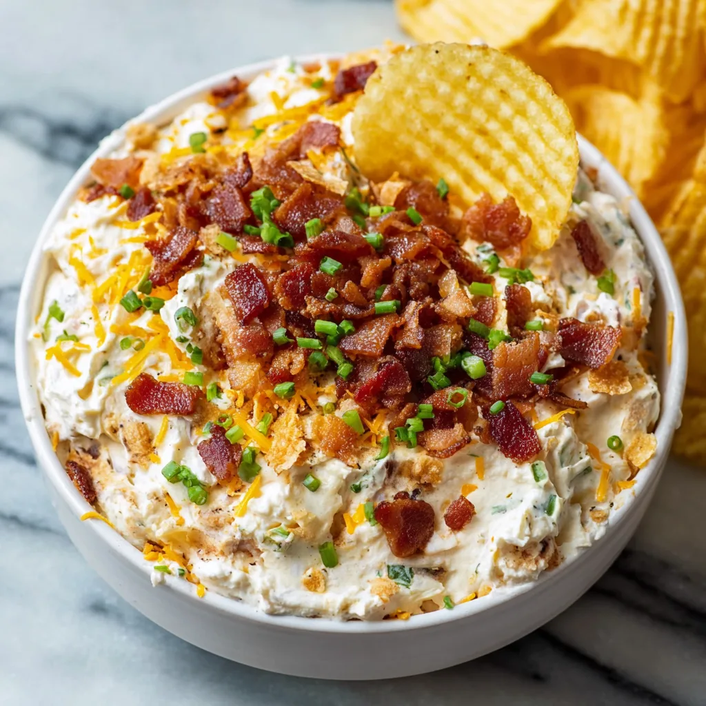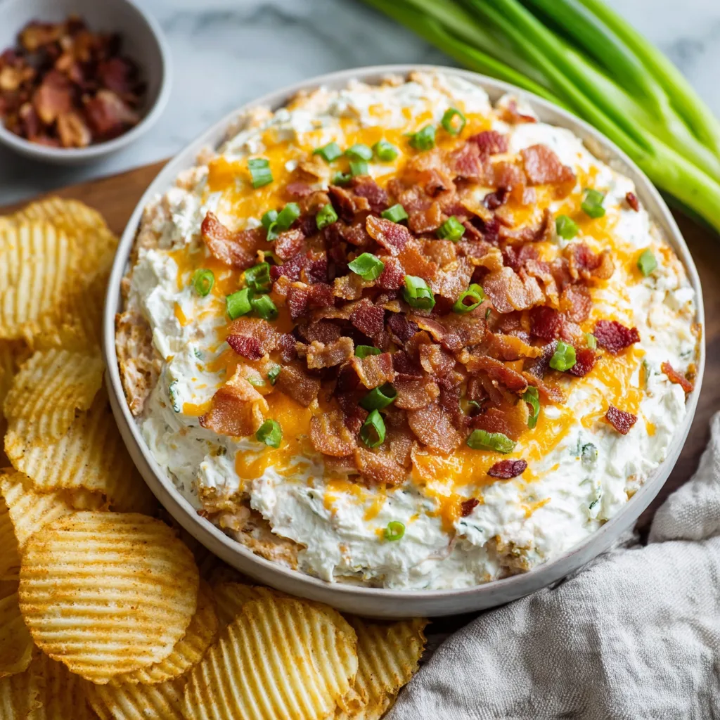 This dip is bold, creamy, and unapologetically indulgent. It’s the kind of appetizer that disappears fast at parties, game days, family gatherings, and holiday spreads. Each scoop delivers the familiar flavors of sour cream, sharp cheddar, smoky bacon, and green onions—everything you’d pile onto a baked potato—without ever turning on the oven.