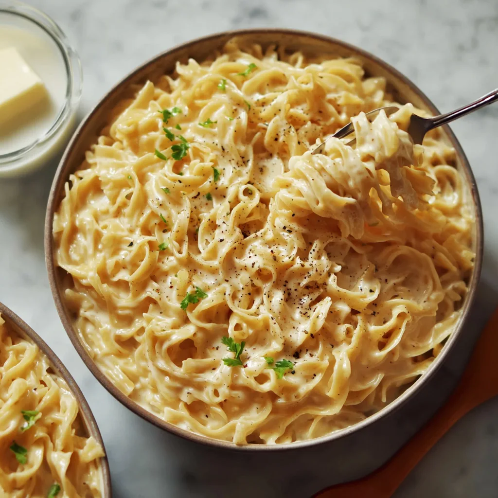 These noodles are rich, buttery, and coated in a smooth, savory cream sauce that feels familiar in the best way possible. They’re not trying to be trendy. They’re not trying to impress. They exist to comfort, to fill the kitchen with cozy smells, and to make everyone at the table feel at home.