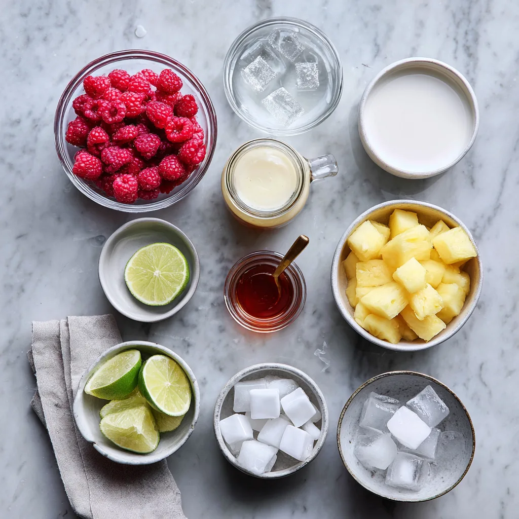 - Add raspberries, frozen pineapple chunks, coconut milk, pineapple juice, honey (or simple syrup), and lime juice to a high-speed blender.