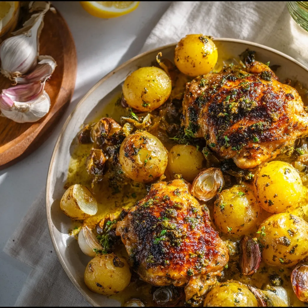 Roasted Mediterranean Chicken Thighs with Crispy Baby Potatoes: A Flavor-Packed, One-Pan Dinner Masterpiece