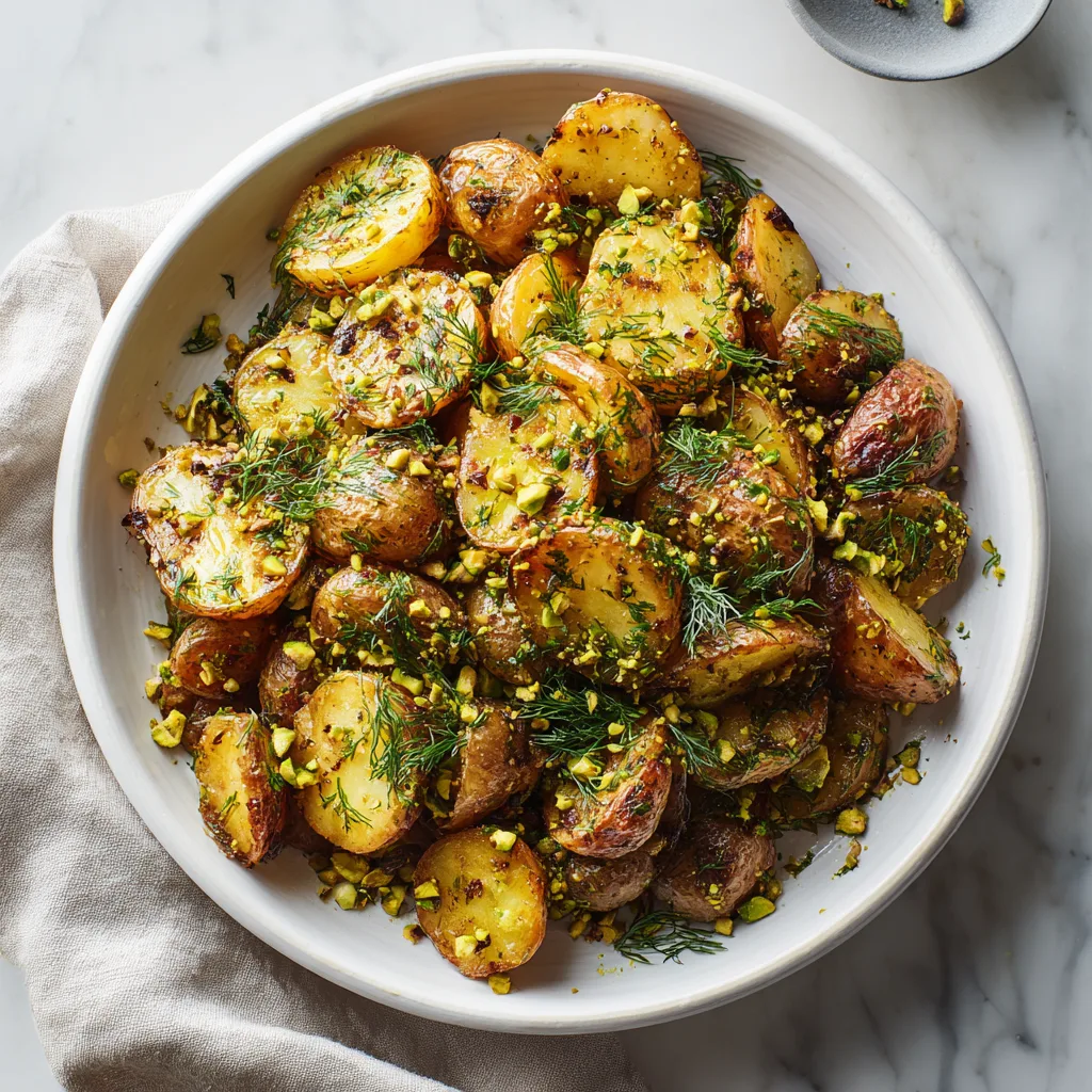 If preparing ahead, roast the potatoes earlier in the day and assemble with herbs and pistachios just before serving to maintain freshness and crunch.