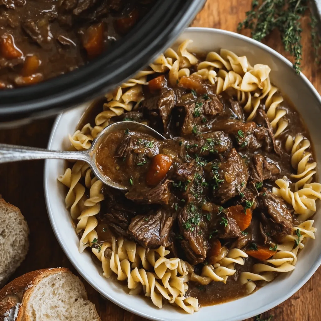 All-day simmering allows the beef to tenderize while infusing the broth with a deep, savory flavor. Once the noodles go in near the end, they soak up the rich gravy — no extra pans, no babysitting required.