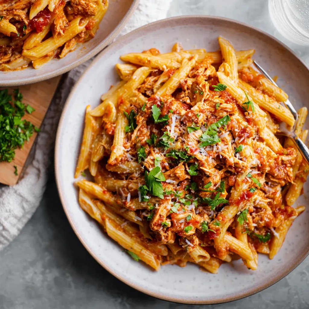 Remove chicken breasts and shred with two forks. Return shredded chicken to the slow cooker and stir until fully incorporated into the sauce. - Cook the Pasta
