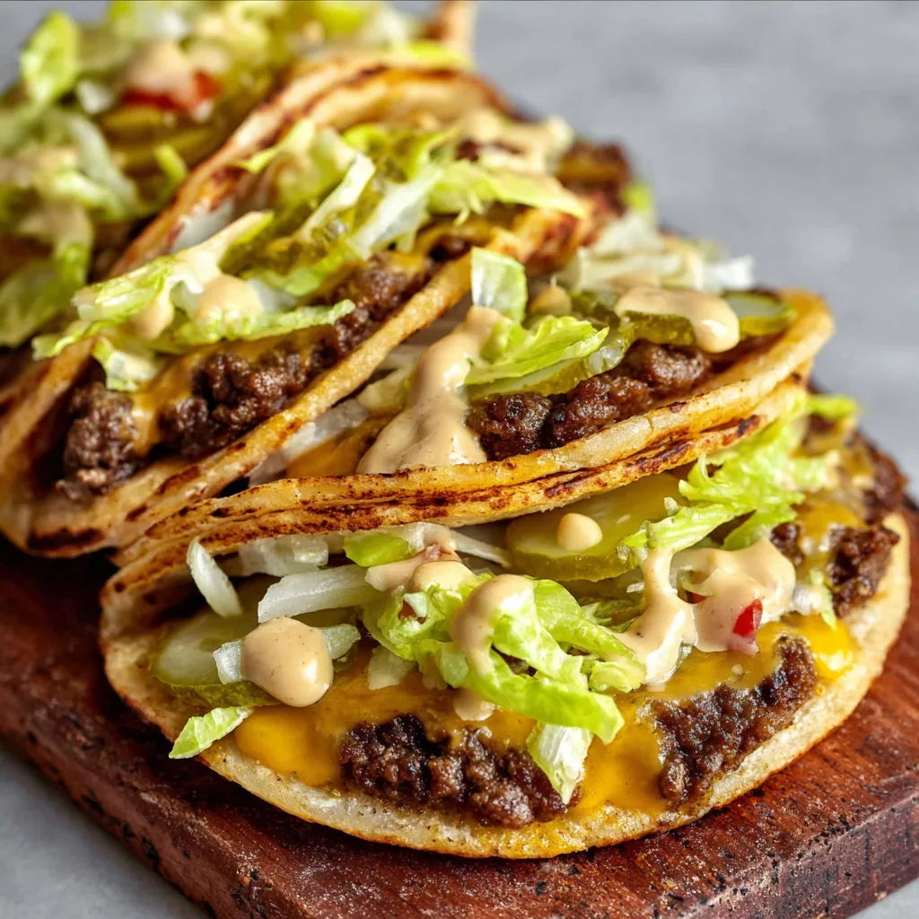 Remove tacos from the skillet. Top with shredded lettuce, diced pickles, chopped onions, and a generous drizzle of burger sauce. - Fold and Serve
