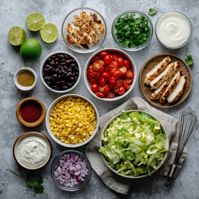 In a large bowl, combine chopped romaine, black beans, corn, cherry tomatoes, avocado, red onion, and cilantro. - Add the chicken.